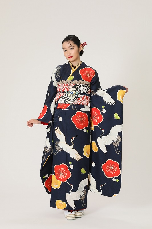 紺の振袖は、日本では「上品・清楚・格式ある色」として好まれています。深みのある紺は肌を明るく見せ、写真映えが抜群です。どんな柄や小物とも相性が良く、可愛い・かっこいい・大人っぽいなど、どんな雰囲気にも変化させられる“万能カラー”でもあります!