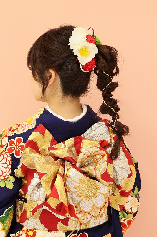 実はヘアスタイルは全体の印象を大きく左右します。最近は、ゆるくまとめたシニヨンや玉ねぎアレンジなど、ラフさのあるスタイルが人気で、紺の上品さに抜け感を加えてくれます。さらに、水引きや金箔、ドライフラワーなどのヘアアクセサリーを組み合わせることで、和とモダンが上手に合わさって、今どきの成人式スタイルが完成します。