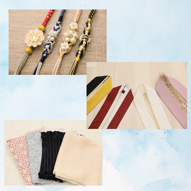 トレンドを取り入れたい方には、ビジュー付きの重ね衿や、華やかなつまみ細工がついた帯締めが人気!