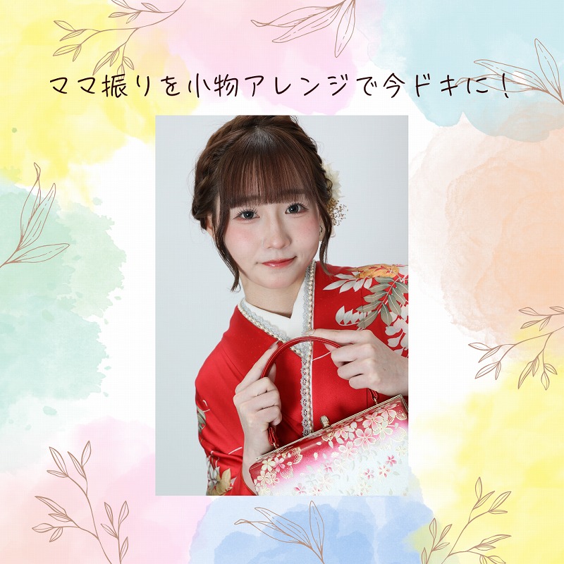 「レンタルして好きな振袖を選びたいお嬢様」と「ママ振りを着てほしいお母様」で意見が分かれることもありますよね。そんな時は、まず一度ママ振りを試着してみましょう。意外と似合ってびっくりする方も多いんです。試着時に小物レンタルで今っぽくアレンジすれば、イメージがガラッと変わります。