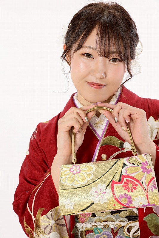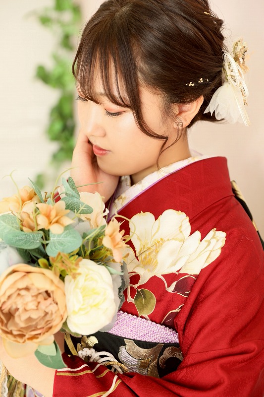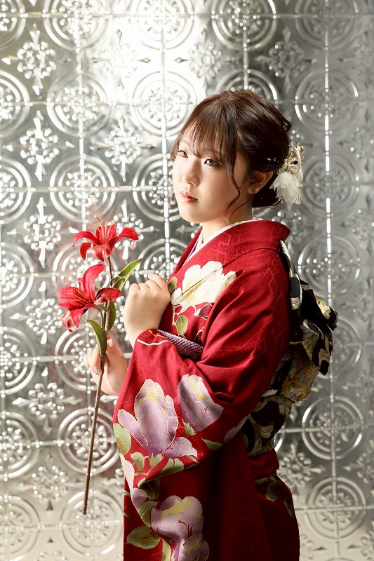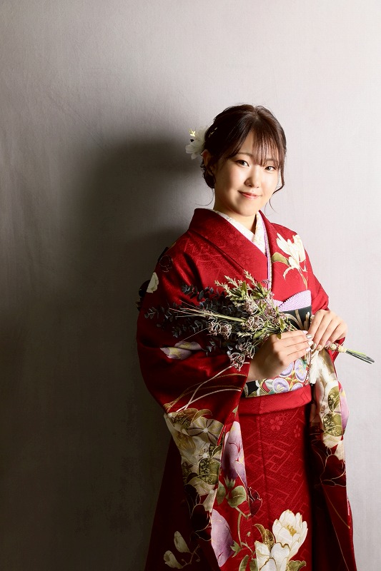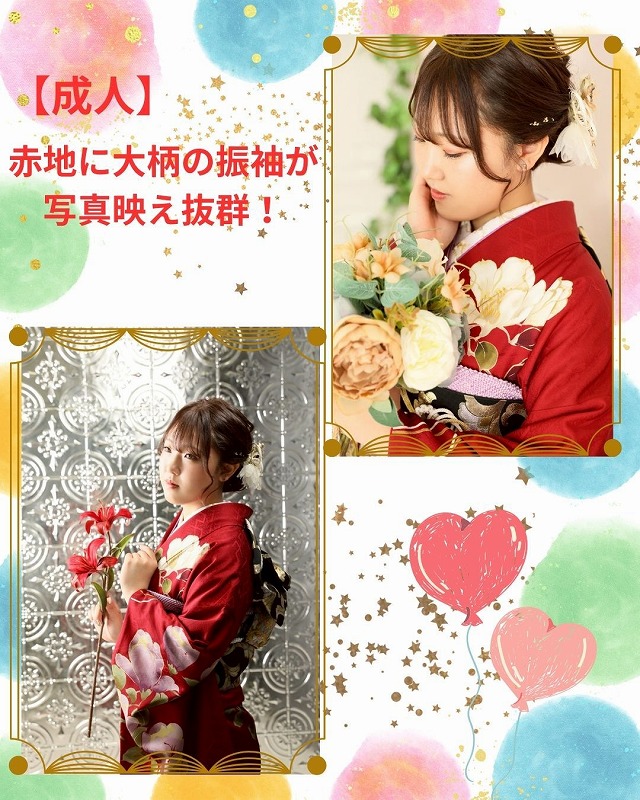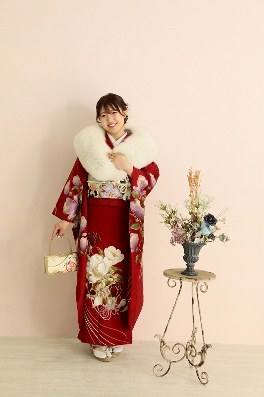 赤地に大柄の振袖を着てくださったお嬢様です♡