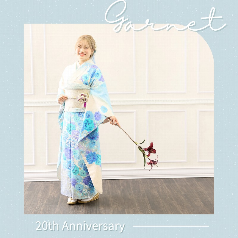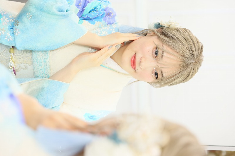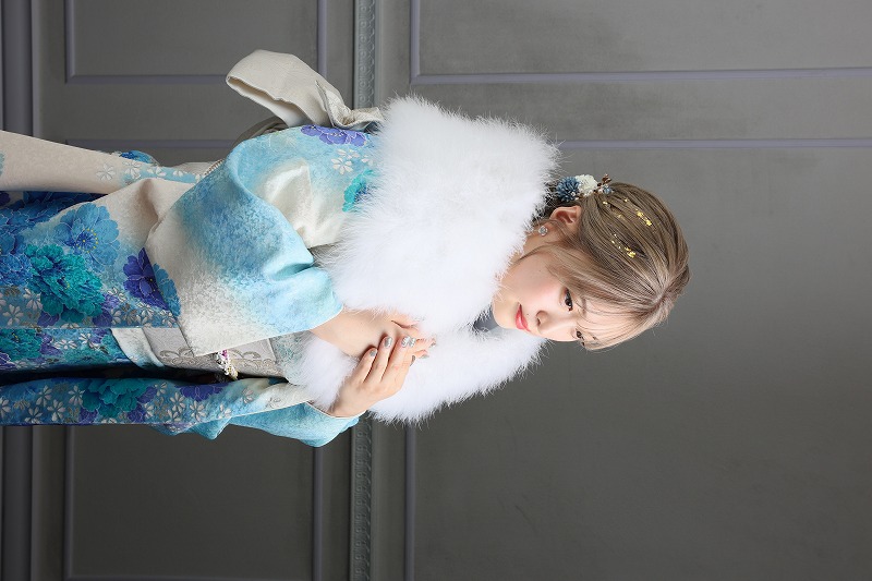 白地に水色の柄がデザインされた振袖は優しい印象で