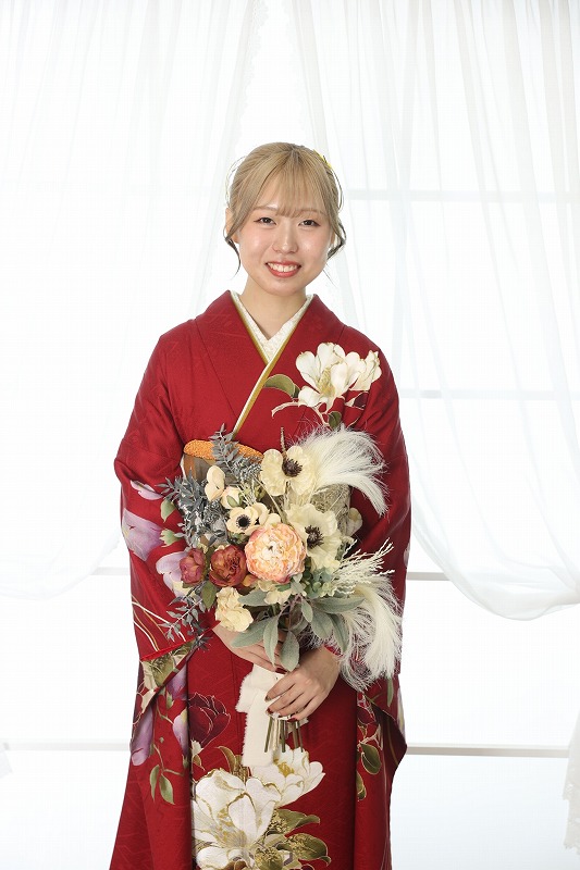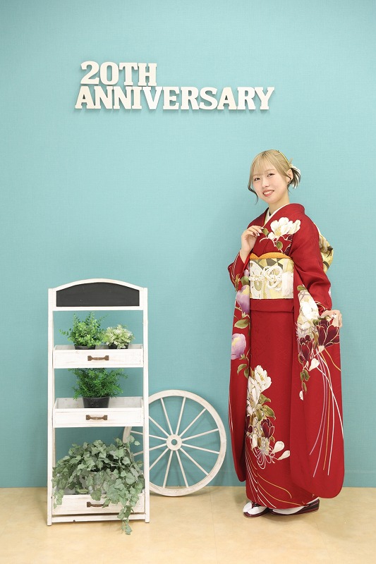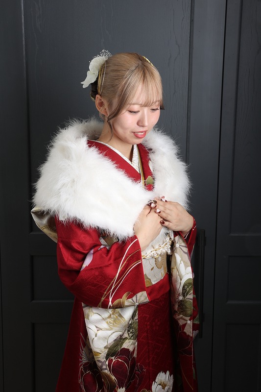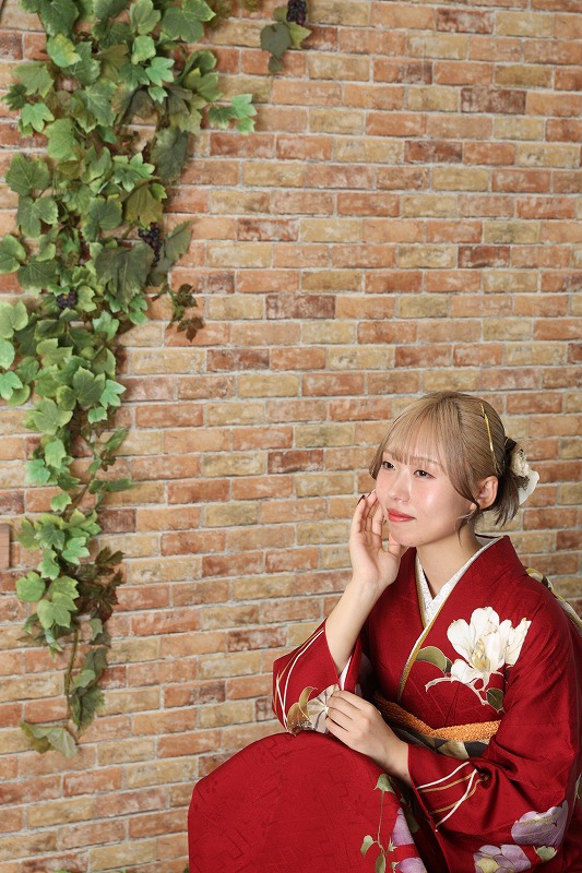 振袖が濃い赤色なのでハイトーンカラーにすることで
