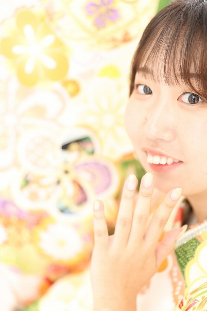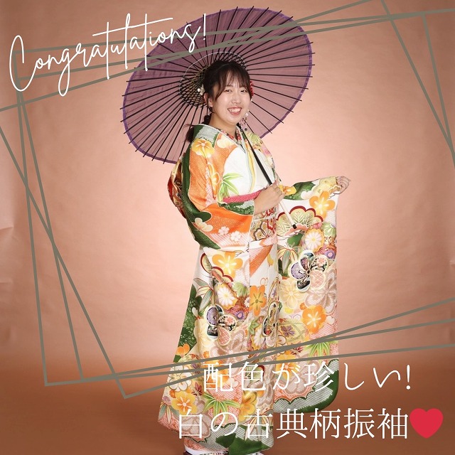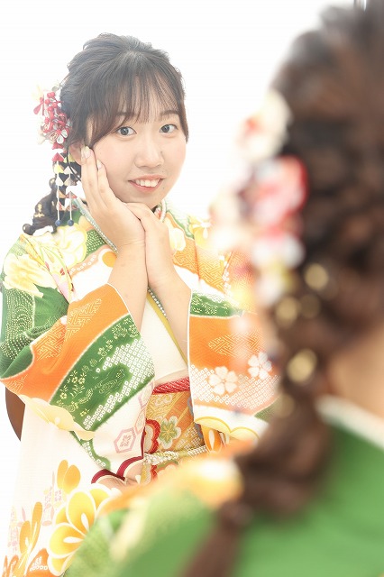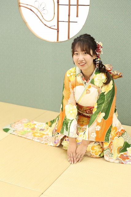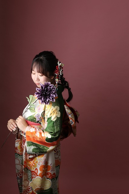 緑とオレンジが入った素敵な振袖を着てくださったお嬢様♡