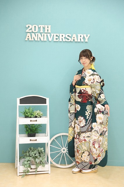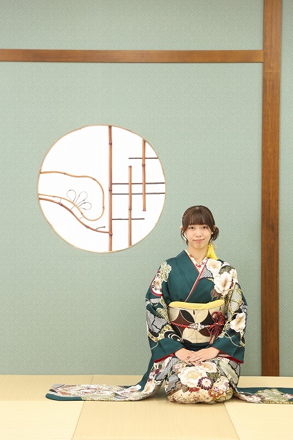 深い緑色の振袖は、落ち着いた大人の魅力を引き立てる効果があります。