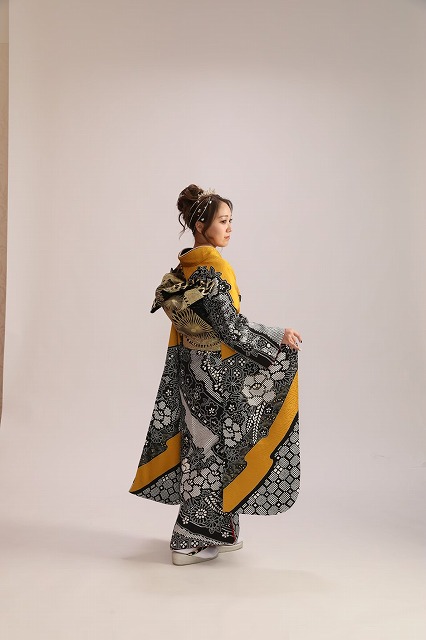 後ろ姿でも黄色と絞り柄の入り方がおしゃれで