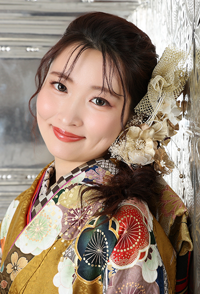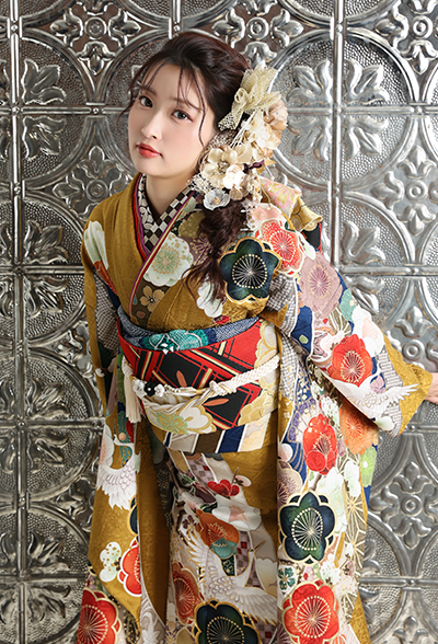古典柄と相性の良い黄土色でおしゃれなレトロモダンの振袖姿が完成!