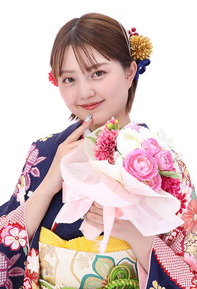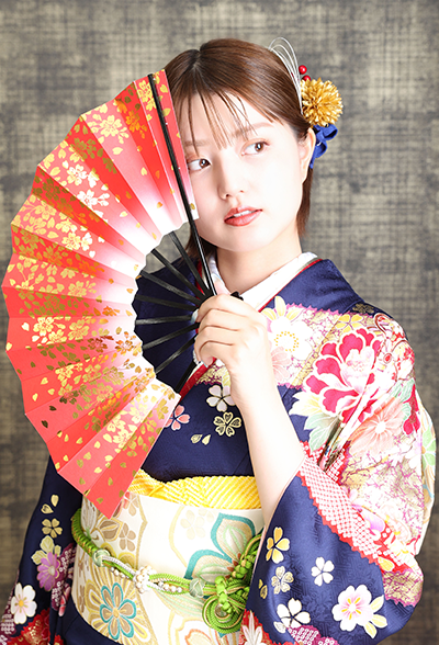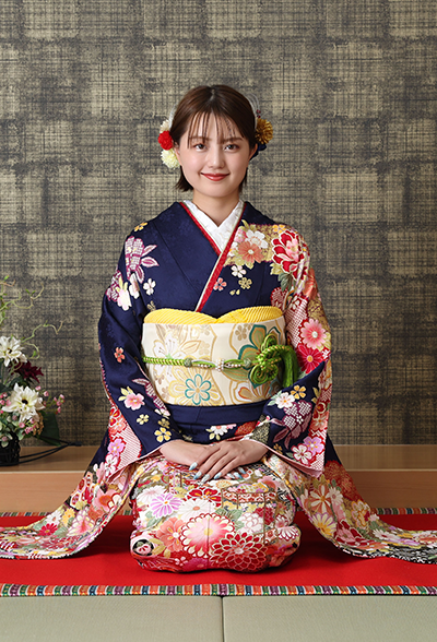 落ち着いた紺色に可愛い古典柄で、大人可愛い振袖姿を叶えられます!