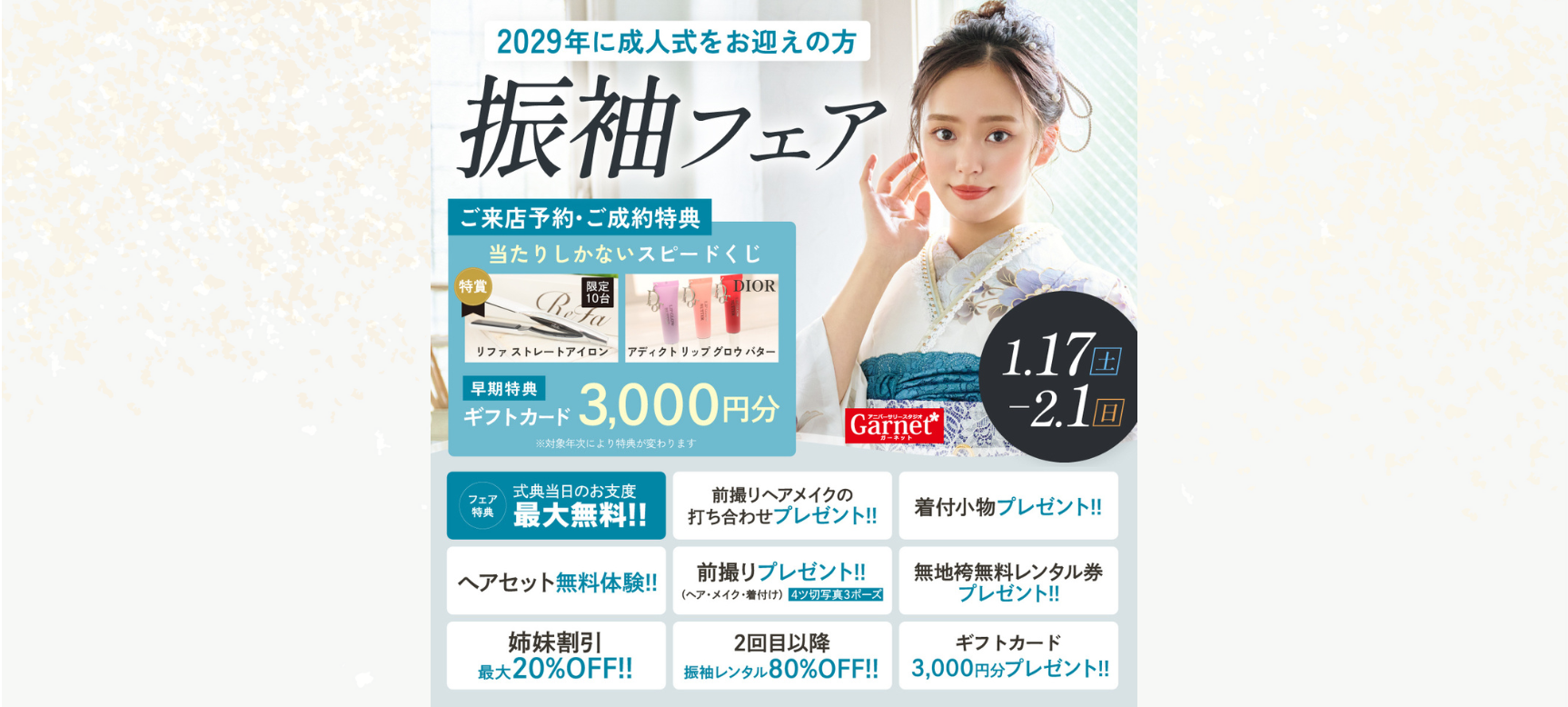 ガーネットは特典併用できるので振袖フェアが1番オススメです♡