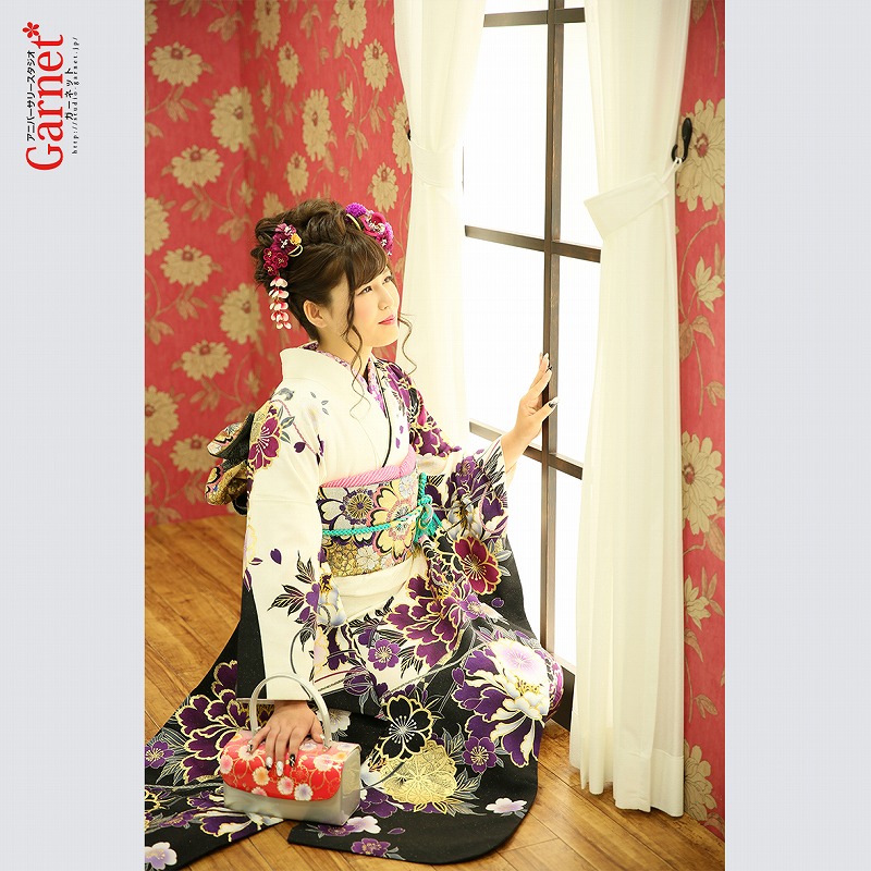 白地に黒と濃い紫がアクセントとしていて入っているお振袖なのでとてもかっこいい印象です!