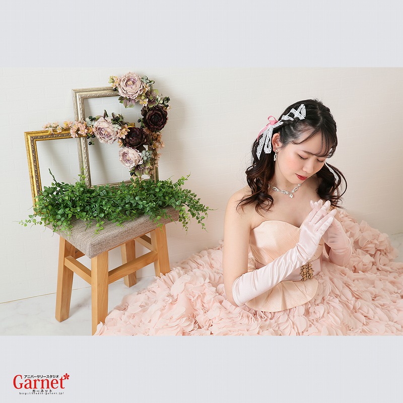 淡いピンクのドレスを着て撮影しました。