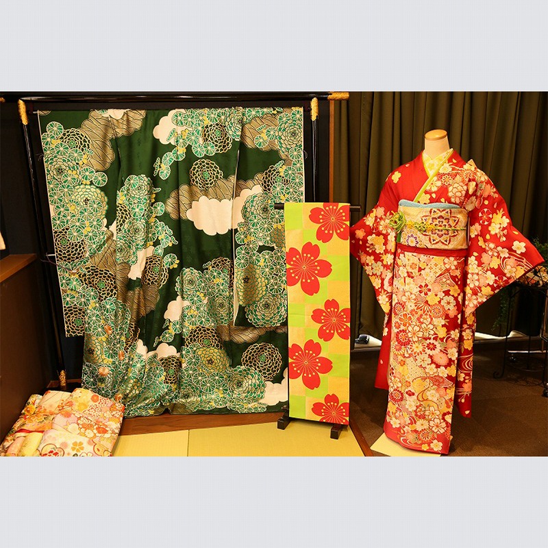 緑の豪華な振袖を衣桁にかけました( *´艸`)