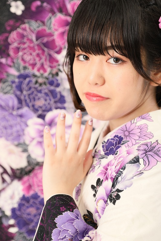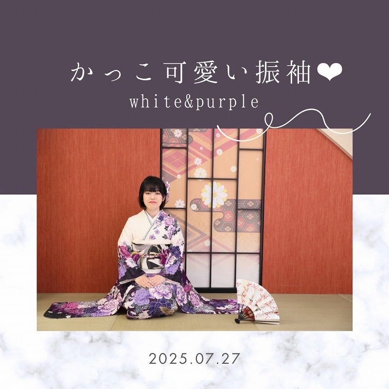白地に華やかな紫の洋風柄が可愛いく大人っぽく