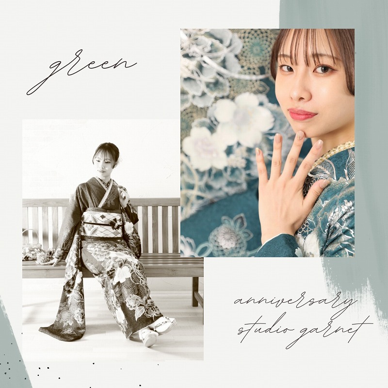 色味がめずらしく、青みもある緑の振袖です(^^)