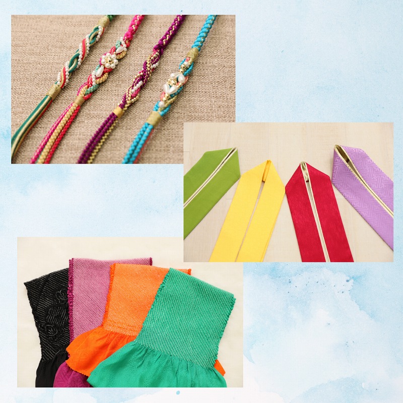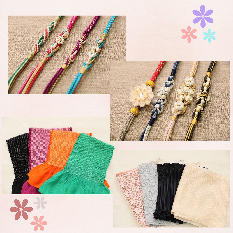 トレンドを取り入れたい方には、ビジュー付きの重ね衿や、華やかなつまみ細工がついた帯締めが人気!
