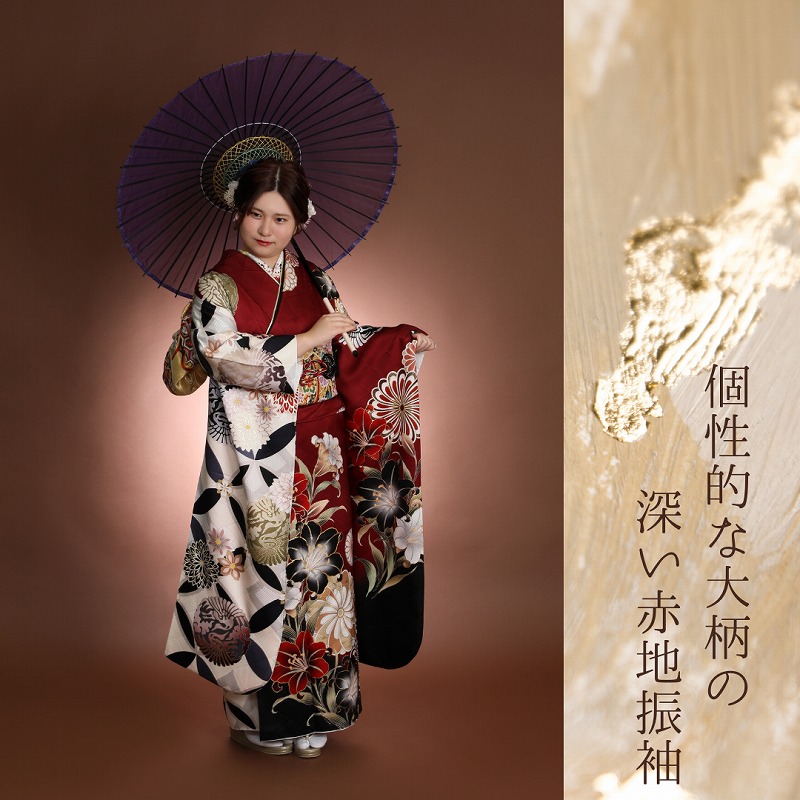 写真にも会場でも映えるデザインの赤振袖♪