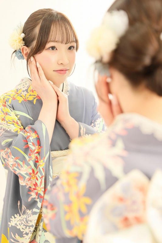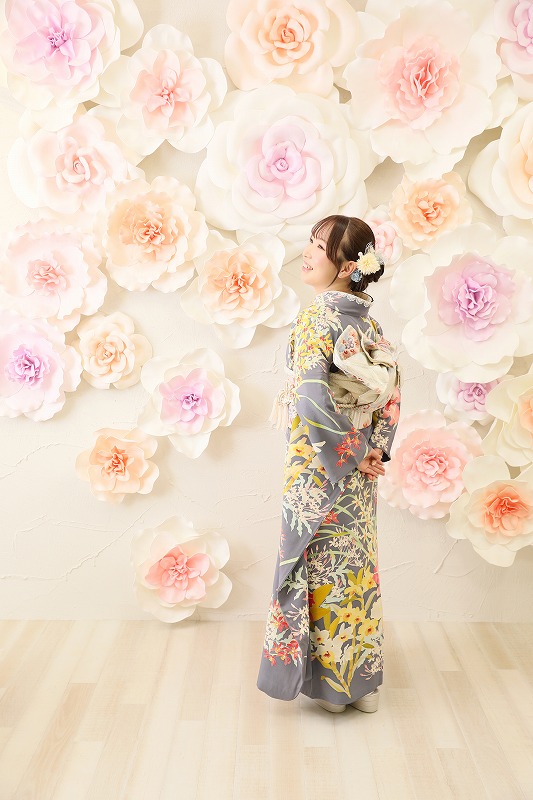 グレーの振袖がやわらかく上品な印象の振袖で、