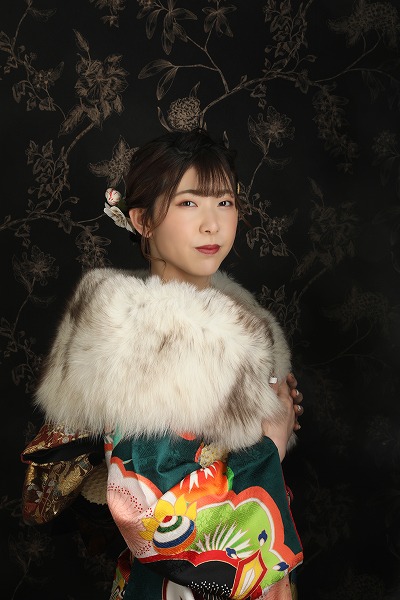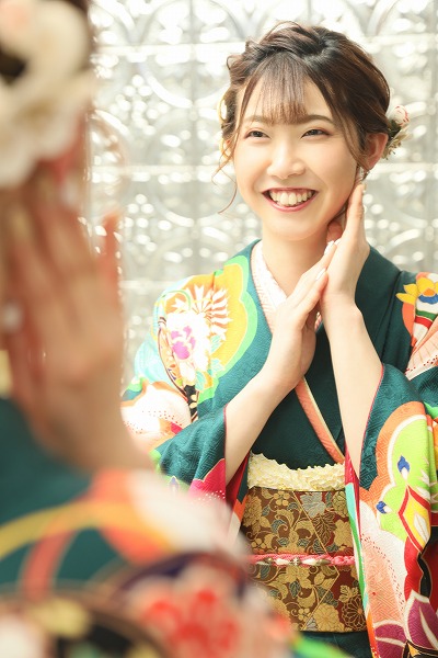 今回のブログでは、鮮やかな緑の地に、モダンな大輪の花が印象的な振袖を着こなしてくださったお嬢様のお写真を紹介いたします。