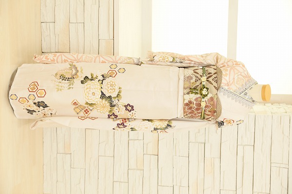 全体的に淡く、くすみ系でまとめられたデザインの振袖。