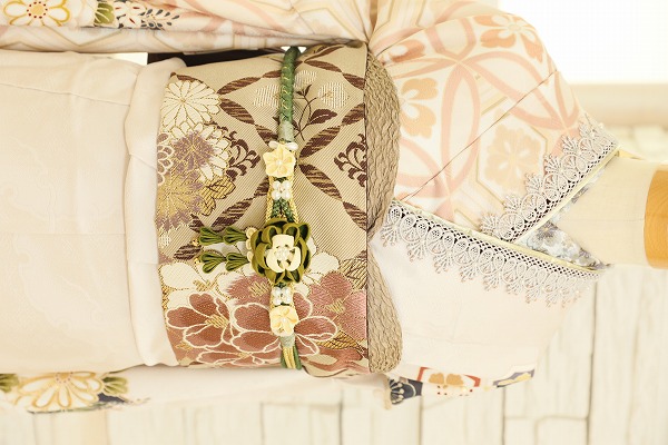 帯や襟元は白でまとめて、花の色に合わせたピンクを差し色に。