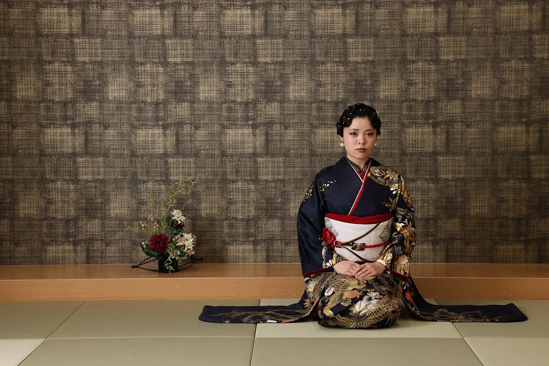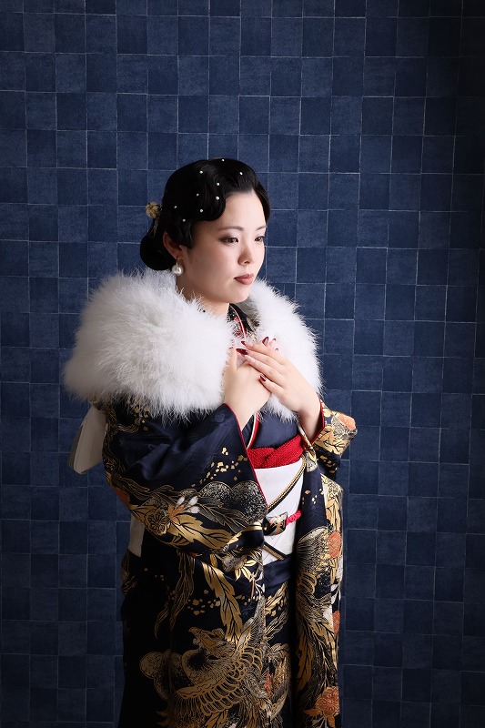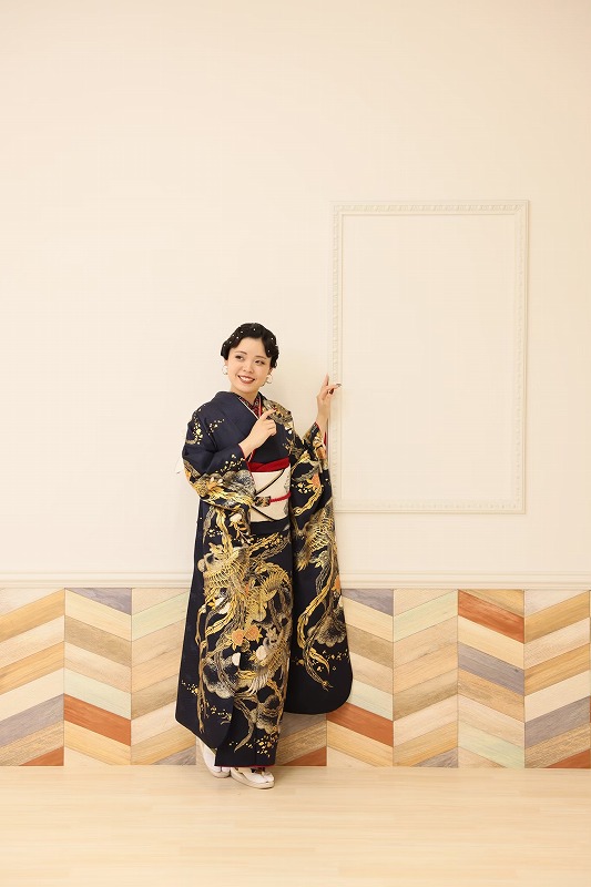 濃い紺色に鳳凰が大胆に入ったかっこいい振袖を