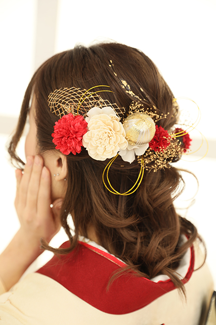ハーフアップで可愛くて、髪飾りも振袖の色に