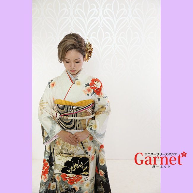 白地のかっこいいお振袖に赤い背景映えますね♪