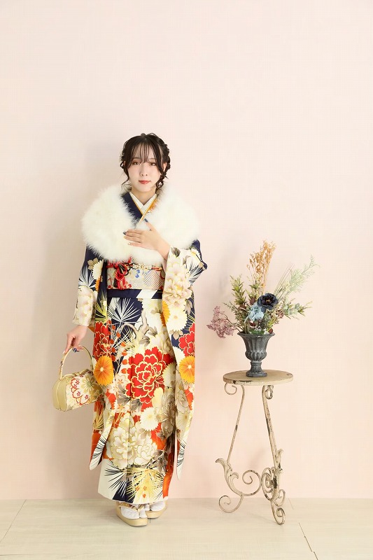紺色に大きな牡丹柄で、赤とゴールドで豪華な