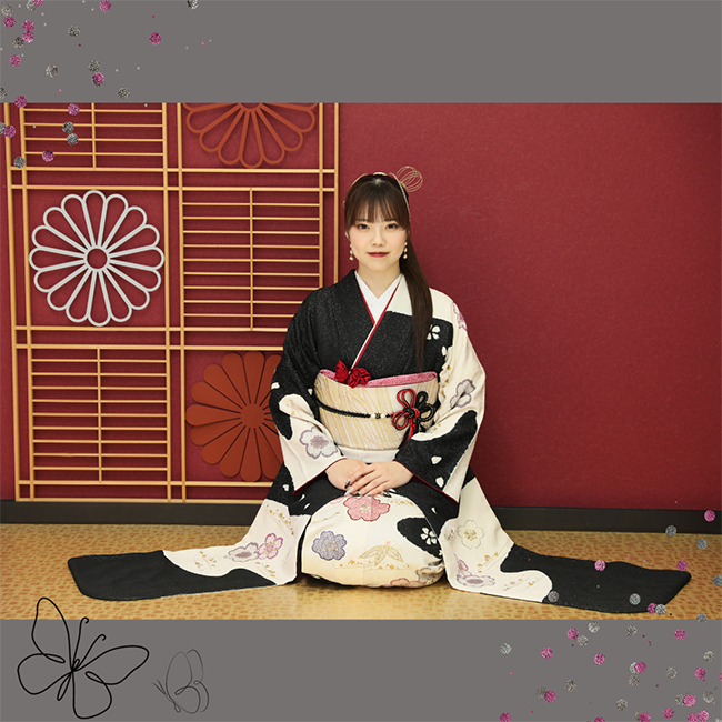 赤色の背景に白黒の振袖がより華やかにみえていますね♪