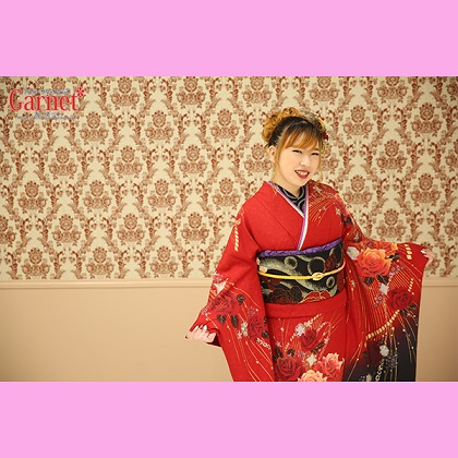 A様のお振袖は赤地に洋柄が入った、
