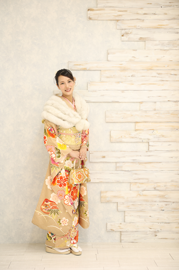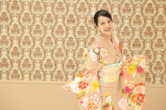 ベージュの大人っぽい振袖を着てくださったお嬢様です!