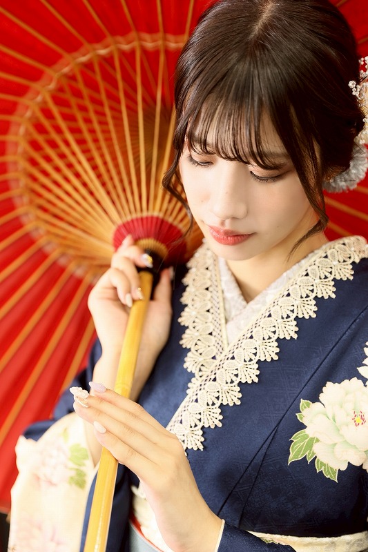 色系でまとめた小物で、大人っぽく、紺色の振袖に