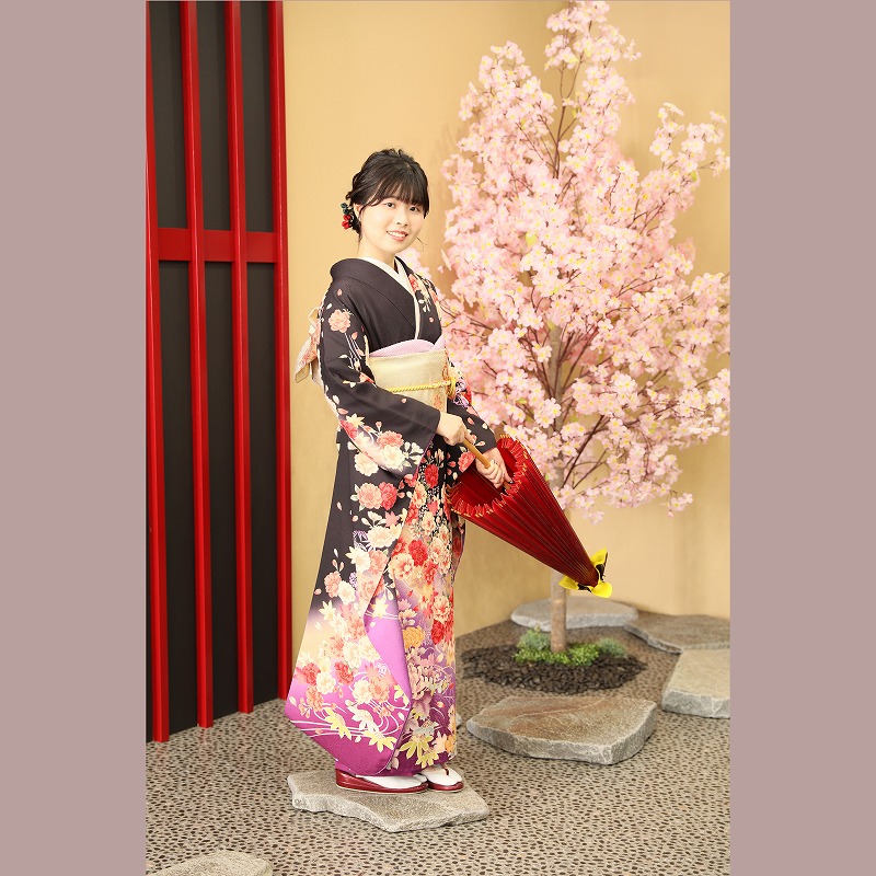 今回ご紹介するのは、黒地に暖色のお花が咲いたお振袖を選んで頂いた、こちらのお嬢様です!