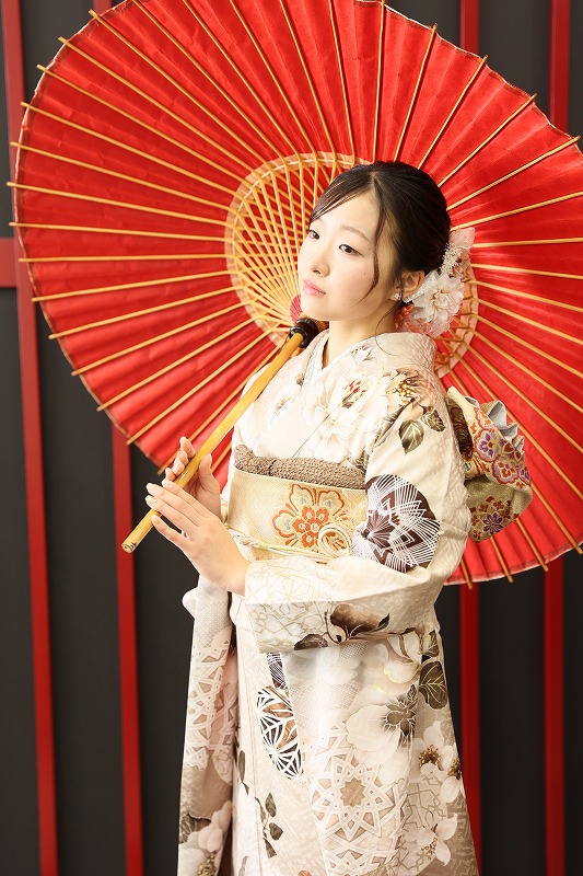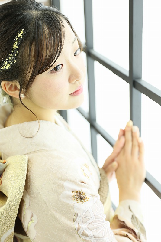 この記事ではベージュの振袖を着てくださった