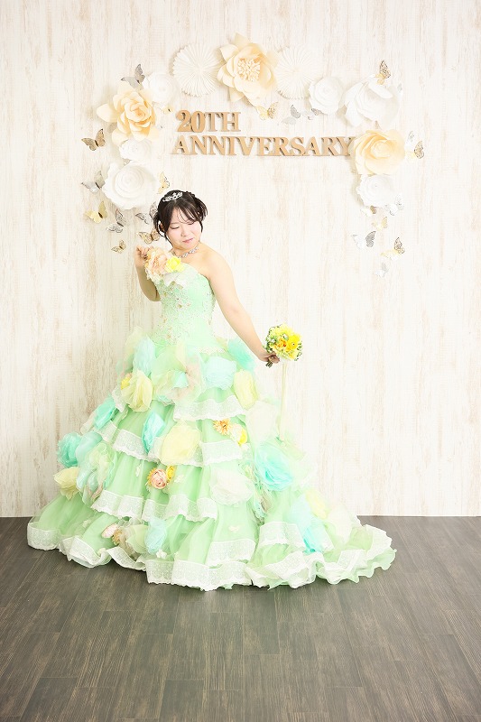 ドレスの色は黄緑色で振袖とは全く雰囲気が違って