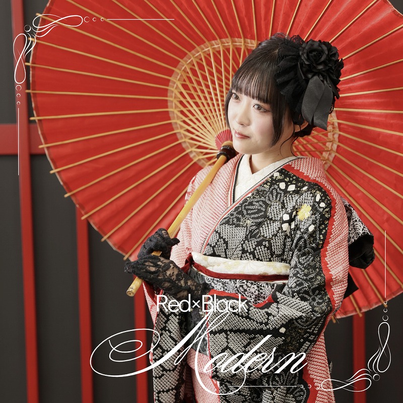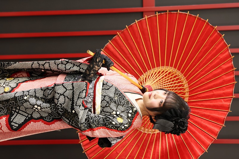衿元にも赤と黒の重ね衿を入れて統一感を出して