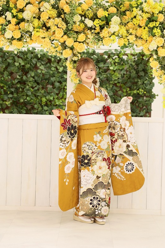 カラシ色に古典柄が描かれた素敵な振袖です♡