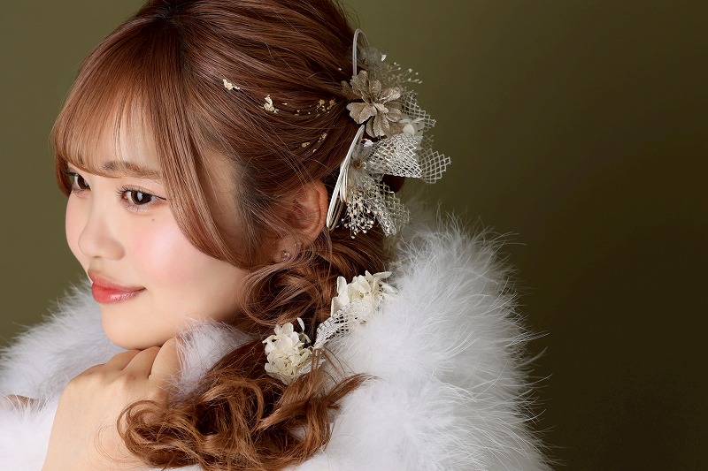ヘアもサイドへ編みおろした可愛いアレンジで