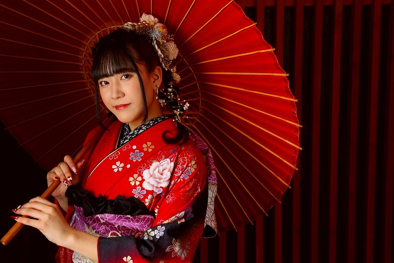 成人式らしさのある赤と、少し大人っぽい洋柄が