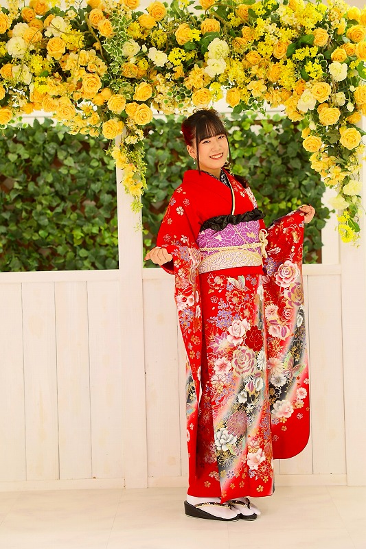 赤の洋風デザインの振袖を着こなしてくださったK様!