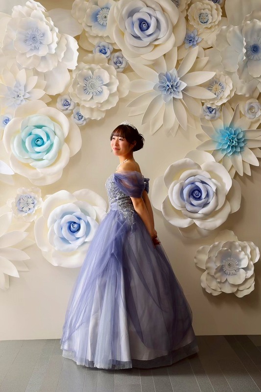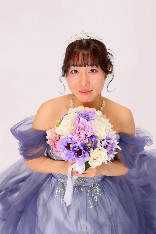 振袖は華やかな赤だったのでドレスはくすみブルーで