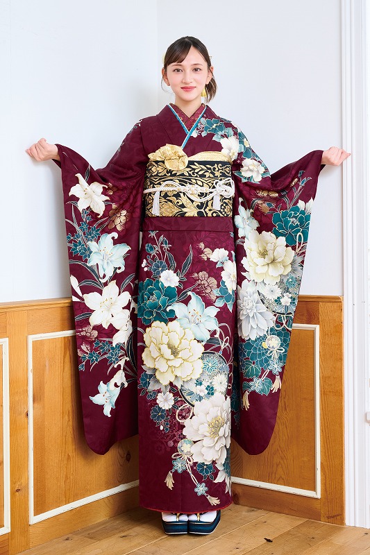 成人式の定番である赤も、えんじやワインレッドに近い深みのある色味を選ぶと、大人らしい雰囲気に。