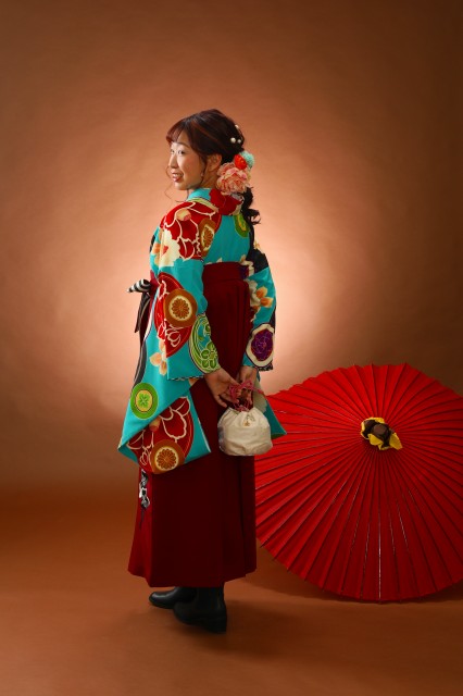 本日は、個性的な水色のお着物と、カワイイエンジの袴を選んでいただいたお客様をご紹介させて頂きます!