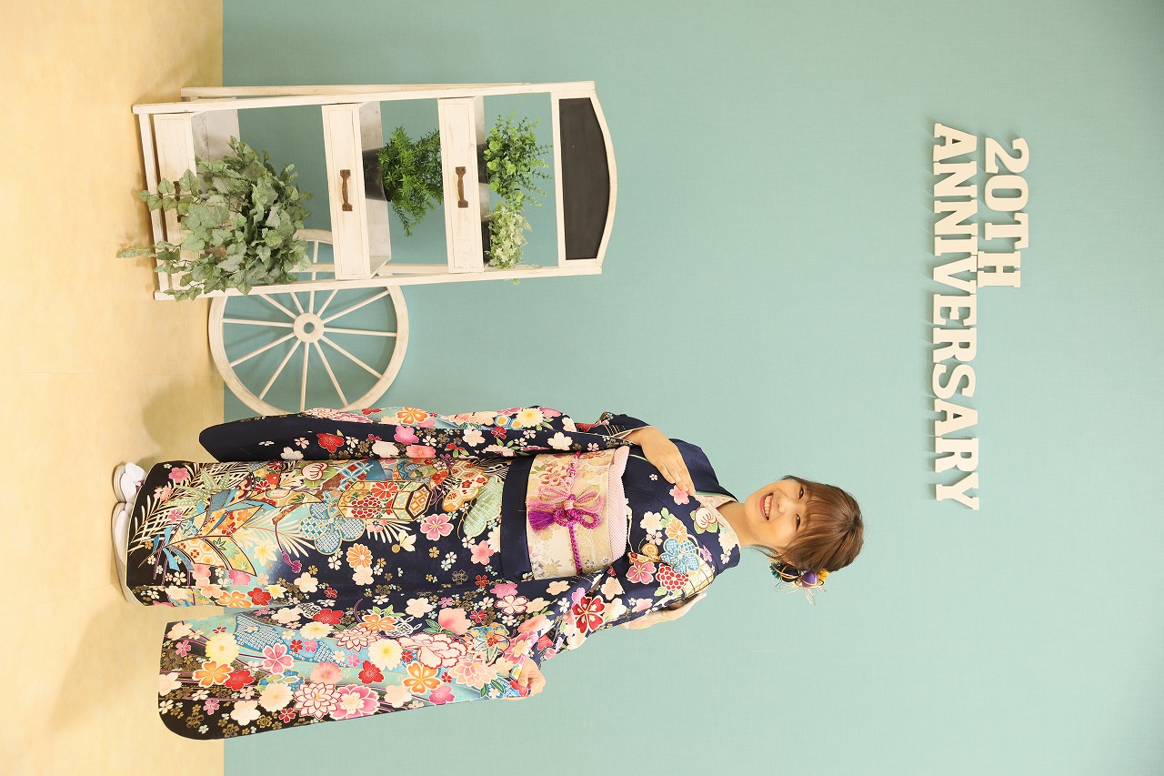 大人っぽさがある紺色のお振袖を可愛くキレイにコーディネートしてくれました!