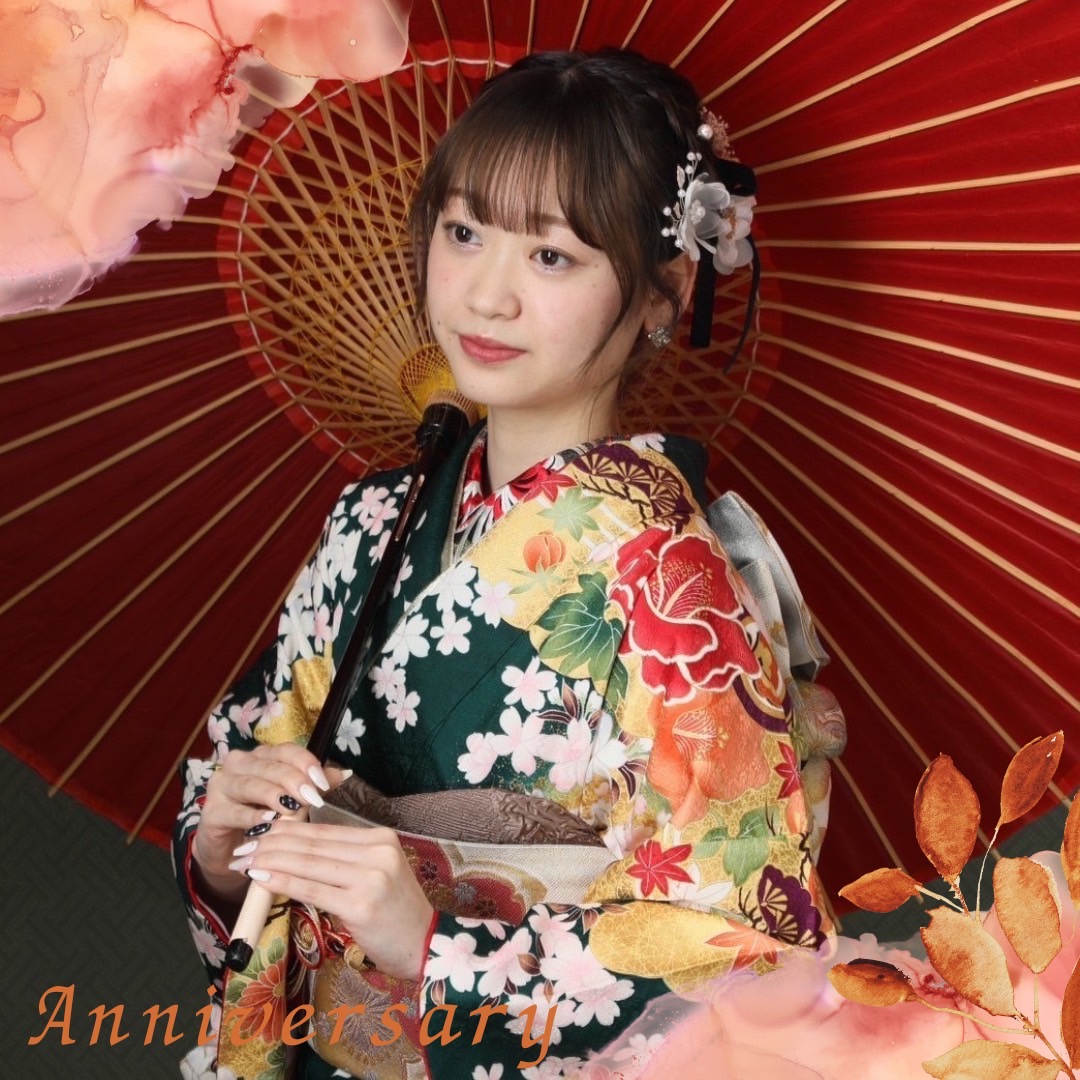 赤の傘に緑色のお振袖がよく映えますね!