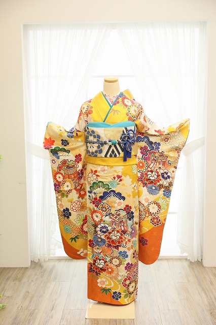 ビタミンカラーの振袖には、ゴールドやシルバーの帯を合わせることで上品さをプラス。落ち着いた色味の帯を選ぶと、全体的にバランスの取れた印象になります。