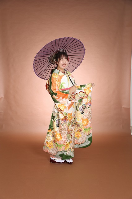 緑とオレンジが入った素敵な振袖を着てくださったお嬢様♡
