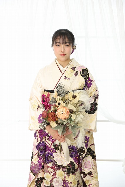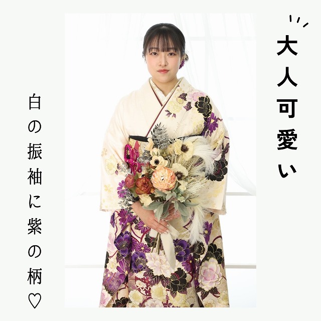 白地に紫の花柄が大人っぽく、上品で華やかな振袖を