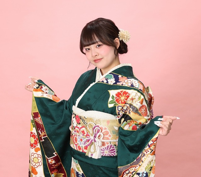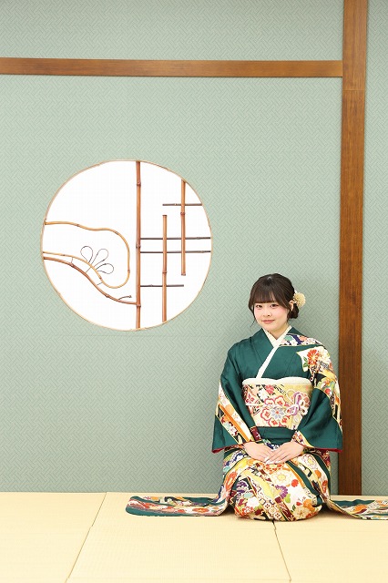 お嬢様が着てくださったのは、緑の古典柄振袖!