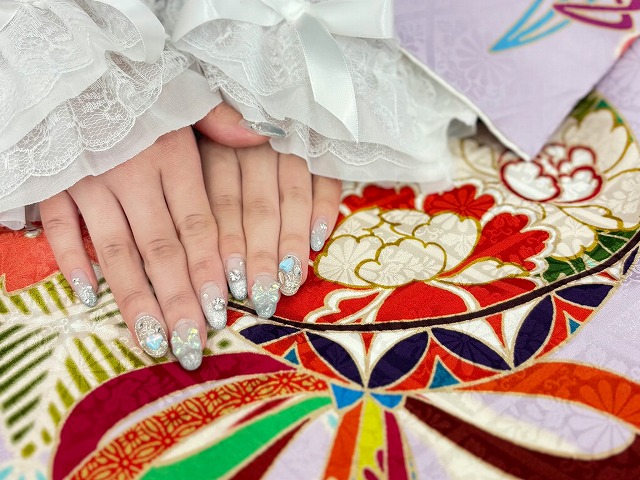 どんな振袖にも似合う白ネイルですが、振袖に白が入っていると統一感が出ます◎